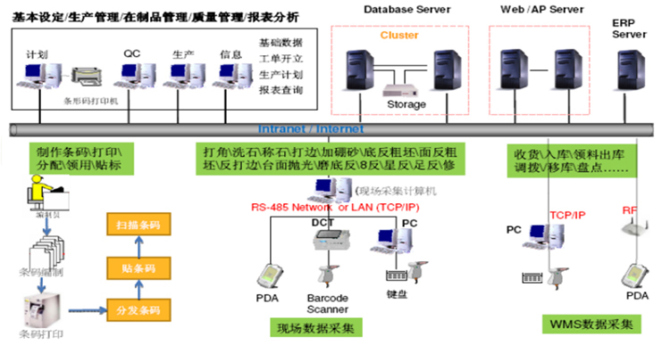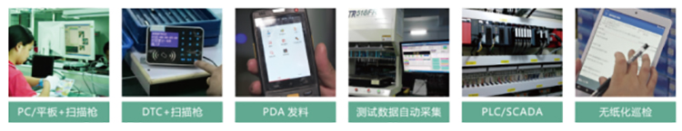 設(shè)備+條碼閱讀器),通過掃描條碼、手工錄入、設(shè)備集成等方式收集關(guān)鍵物料、檢測結(jié)果、軟件版本、測試數(shù)據(jù)、維修、抽檢、包裝、重工等信息。
